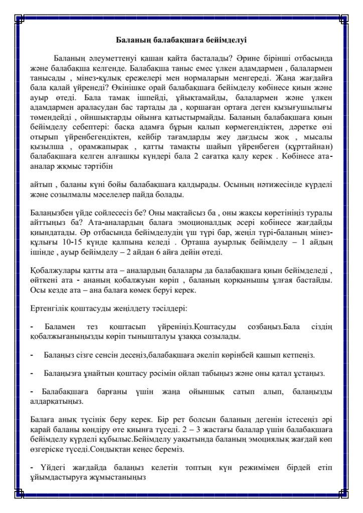 БАЛАНЫҢ БАЛАБАҚШАҒА БЕЙІМДЕЛУІ